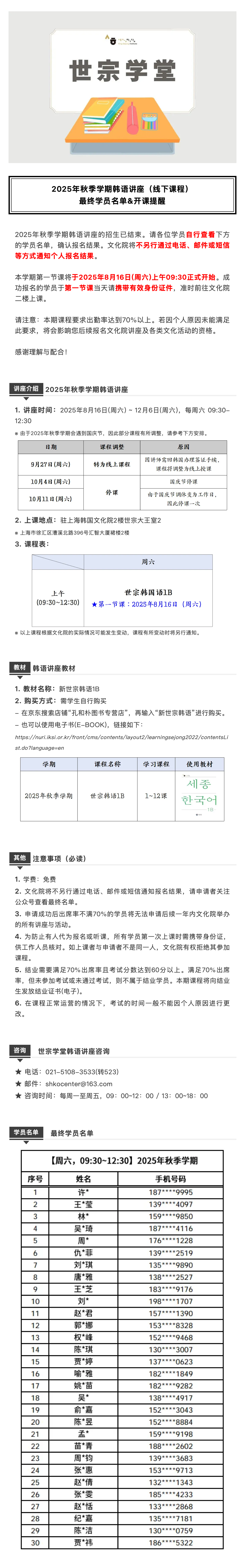 【最终学员名单&开课提醒】2025年秋季学期韩语讲座(线下课程)