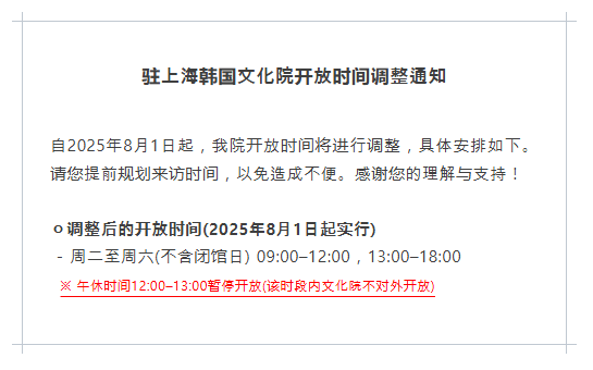 【运营公告】驻上海韩国文化院开放时间调整通知